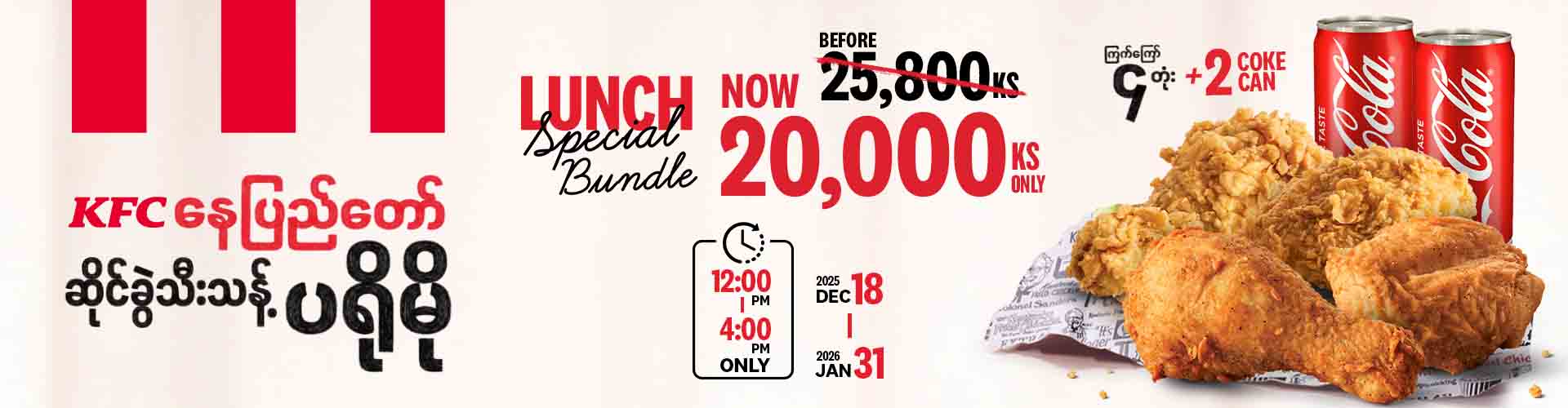 This promotion is available daily from December 18 to January 31, between 12:00 PM and 4:00 PM, exclusively at the Nay Pyi Taw KFC store.
