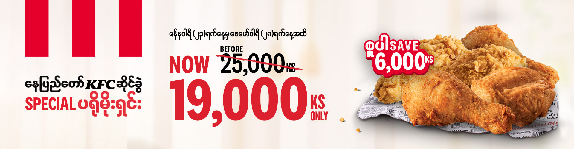 Only at the Nay Pyi Taw KFC outlet, enjoy an exclusive promo where you get 5 pieces of fried chicken at a special price of MMK 19,000 — saving MMK 6,000 off the original price.