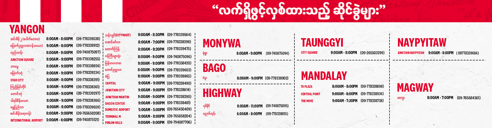 လက်ရှိမှာ ဖွင့်လှစ်ထားတဲ့ KFC ရဲ့ ဆိုင်ခွဲအားလုံးကို ဇန်နဝါရီလ (၂၃)ရက်နေ့မှစတင်ပြီး ဖော်ပြပါလိပ်စာ နှင့် ဆိုင်ဖွင့်ချိန်များအတိုင်း ဖွင့်လှစ်ပြီ ဆိုတဲ့ အကြောင်းကို အနယ်နယ် အရပ်ရပ်မှ KFC အားပေးသူတိုင်းအတွက် အသိပေးအကြောင်းကြားအပ်ပါတယ်။