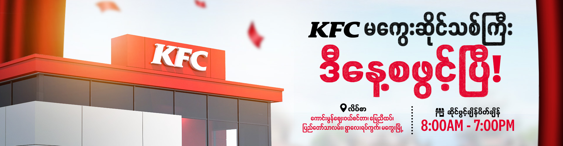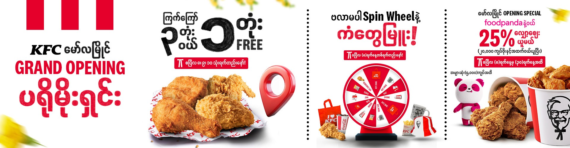မိမိနှင့်နီးစပ်ရာဆိုင်ခွဲမှာ KFC ရဲ့ အရသာအရှိဆုံး ကြက်ကြော်တွေကို ဝယ်ယူအားပေးနိုင်ပါပြီ
