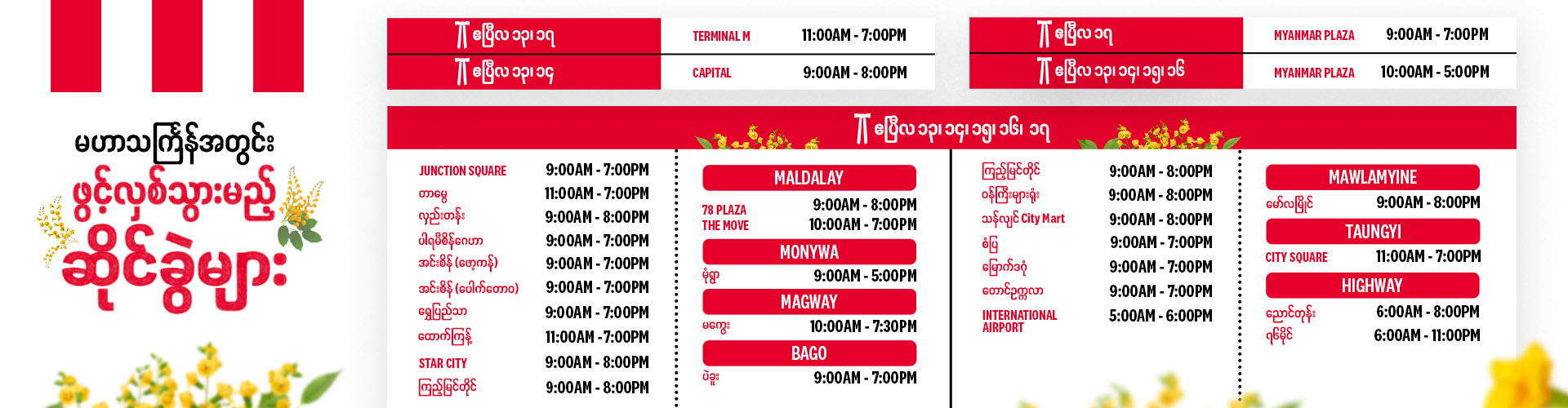 ကြိုတင် Save ထားလို့ရမယ့် KFC ရဲ့ သင်္ကြန်တွင်း ဖွင့်လှစ်မယ့် Store စာရင်းကို ဖော်ပြပေးလိုက်ရပါတယ်နော်။💦